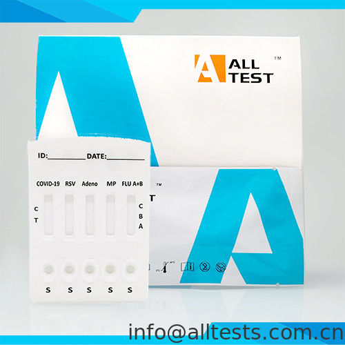 L'essai rapide combiné d'antigène de COVID-19/Influenza A+B/RSV/Adenovirus/M.pneumoniae (écouvillon nasopharyngal) est un immunoessai chromatographique rapide pour la détection qualitative de SARS-CoV-2, de grippe A, de grippe B, d'antigènes syncytiaux respiratoires du virus (RSV), de l'adénovirus et du M.pneumoniae dans les spécimens nasopharyngaux d'écouvillon des personnes avec l'infection suspectée de COVID-19/Influenza/RSV/Adenovirus/M.pneumoniae en même temps que la présentation clinique et les résultats d'autres essais en laboratoire.