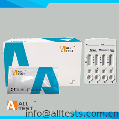 Le test rapide combiné virus de la dengue/Chikungunya/Virus du Nil occidental (sang entier/sérum/plasma) est un test immunologique chromatographique rapide pour la détection qualitative de l'antigène NS1 de la dengue,anticorps contre le virus de la dengue, virus du chikungunya et virus du Nil occidental dans le sang humain entier, le sérum ou le plasma.